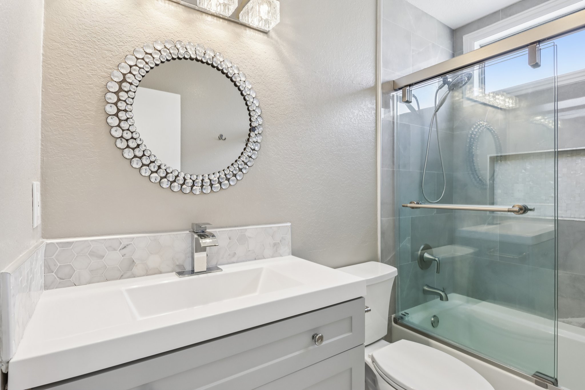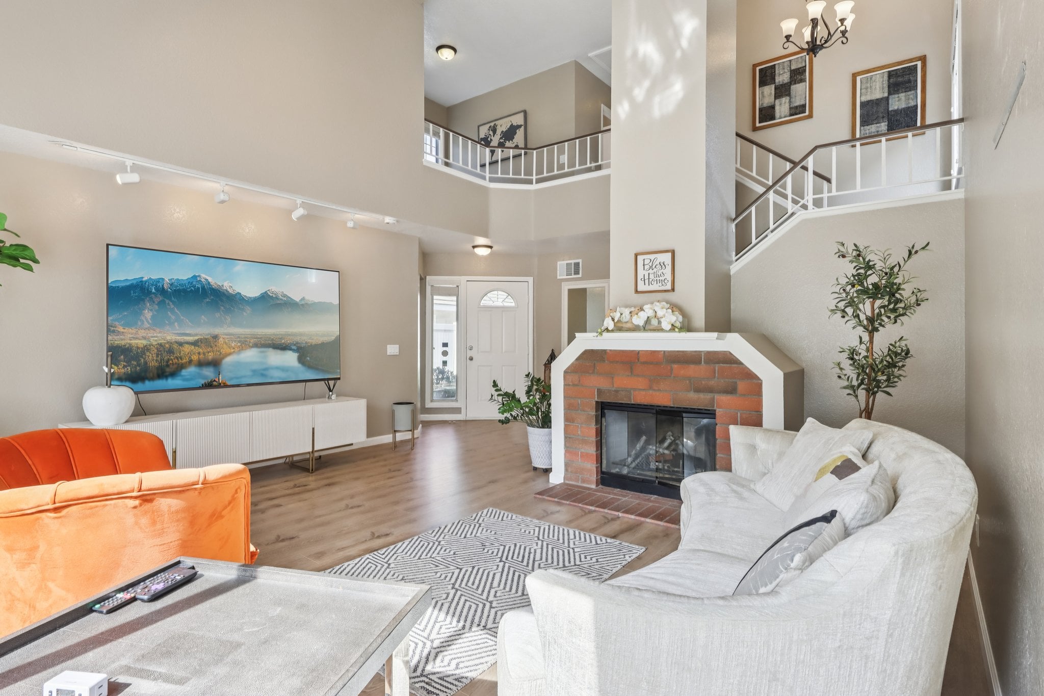 Inside, soaring double-height ceilings and expansive windows flood the formal spaces with brilliant natural light. The seamless flow continues into a masterfully remodeled kitchen featuring crisp quartz and custom shaker cabinetry. Ascend the stairs to find a dedicated office nook and a spacious primary suite, complete with vaulted ceilings and a spa-inspired bath. Two additional bright bedrooms complete the upper level.