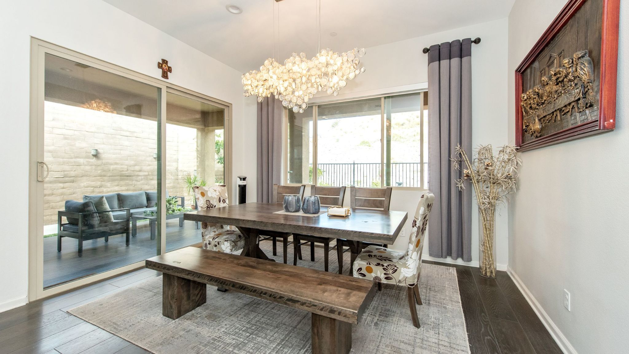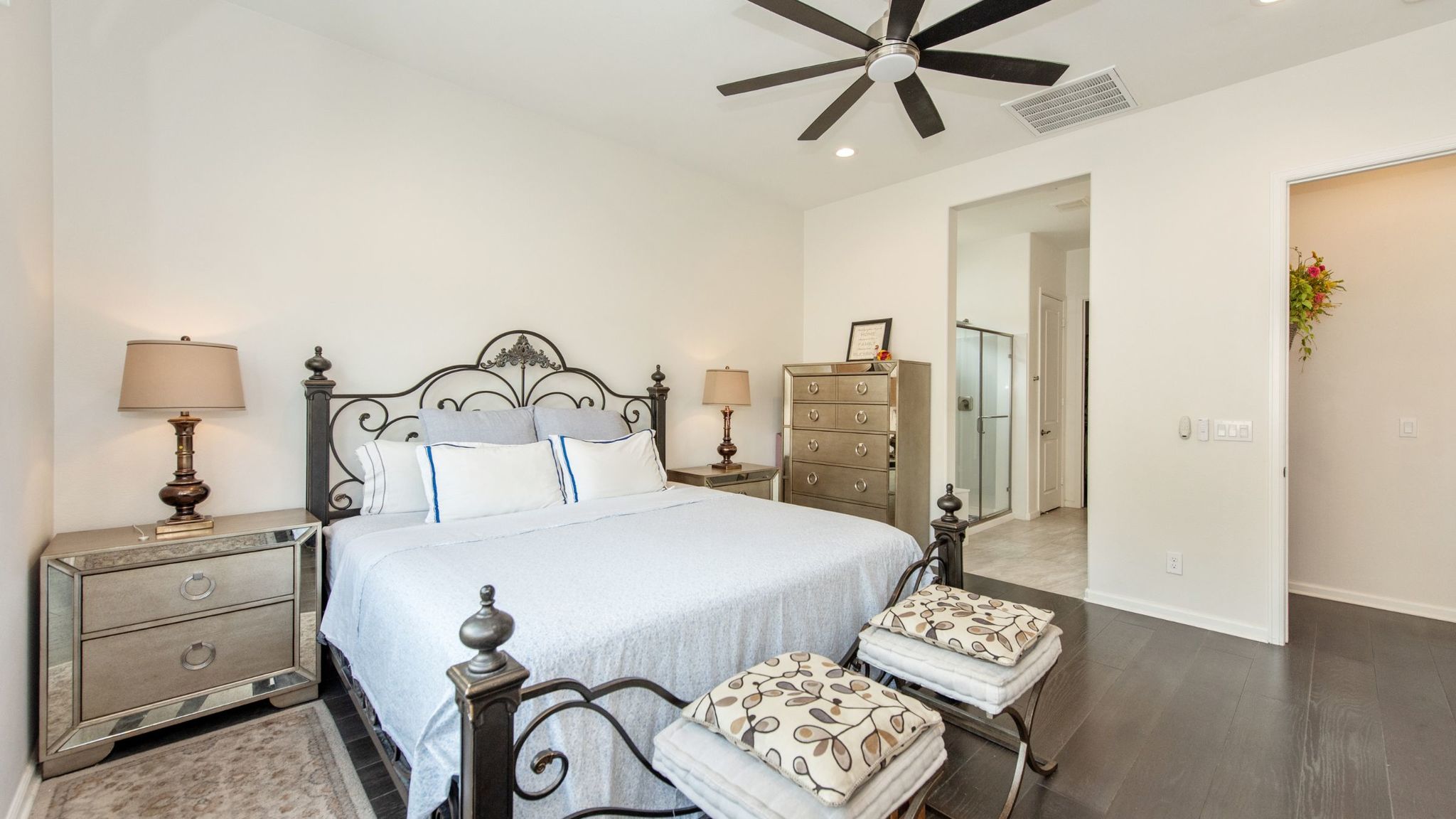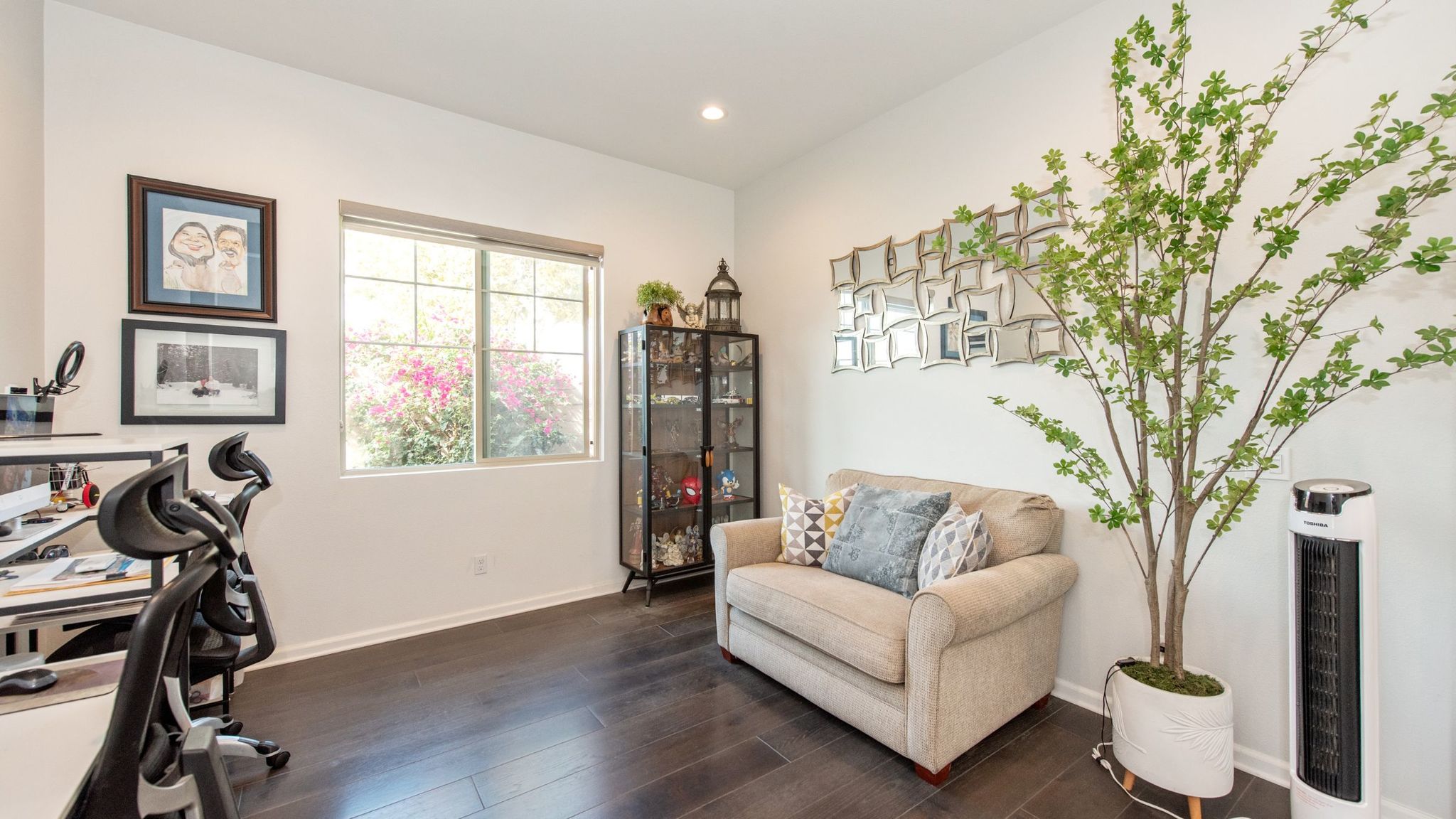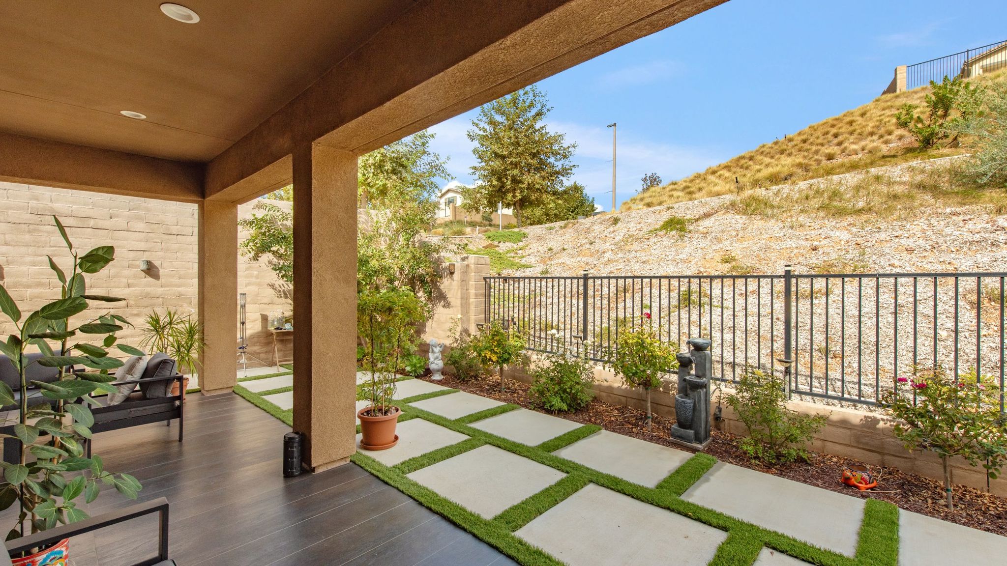 The private, low-maintenance backyard patio is ideal for tranquil entertaining. A master suite offers a walk-in closet with sensored lighting, while the second bedroom provides flexible office space.