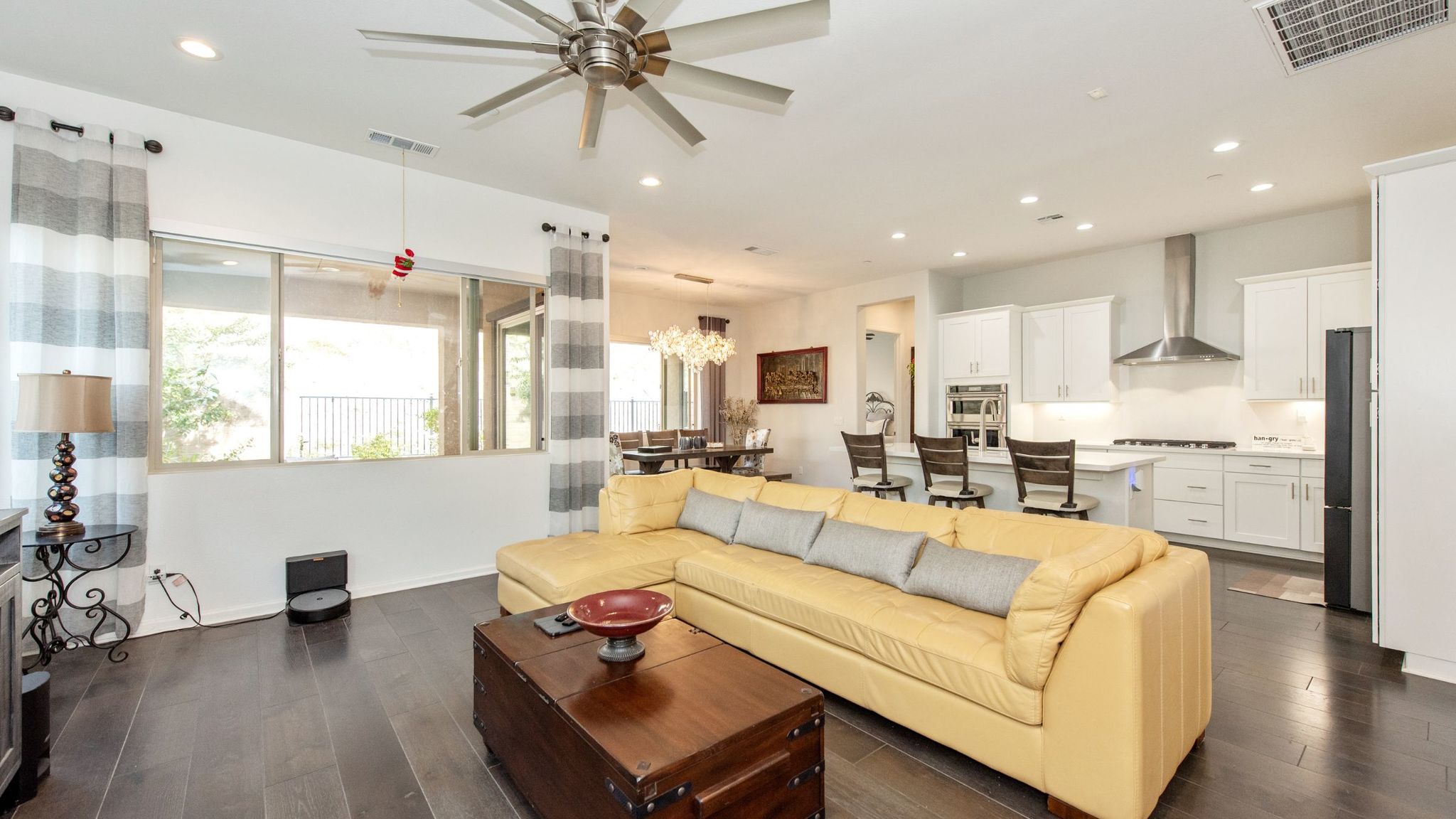 Enjoy immediate comfort and lasting energy savings with the fully paid-off solar system. The open-concept interior features continuous upgraded wood flooring, recessed lighting, and earthy tones. The gourmet kitchen boasts upgraded Quartz countertops, a sensor faucet, and a premium KitchenAid suite with a 6-burner range.